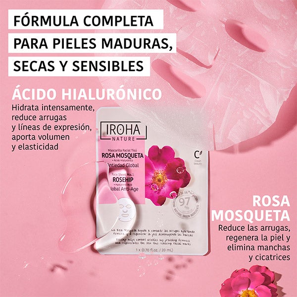 Esta mascarilla es totalmente compostable y vegana. Ideal para pieles maduras o para quienes deseen prevenir los signos visibles de la edad.