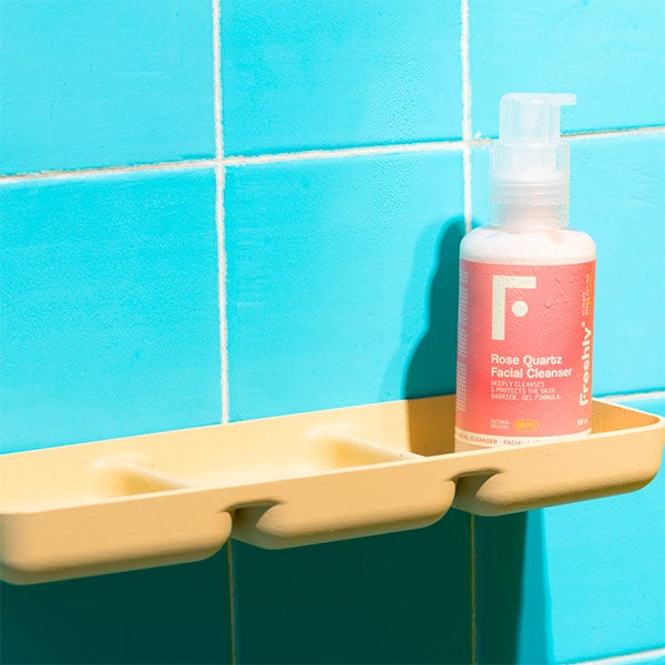 - Con el rostro húmedo, presiona dos veces el dosificador del Rose Quartz Facial Cleanser.