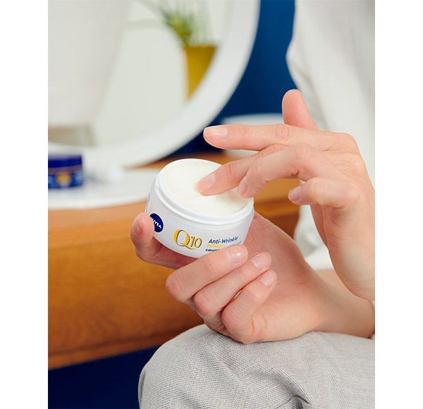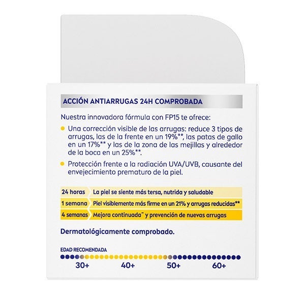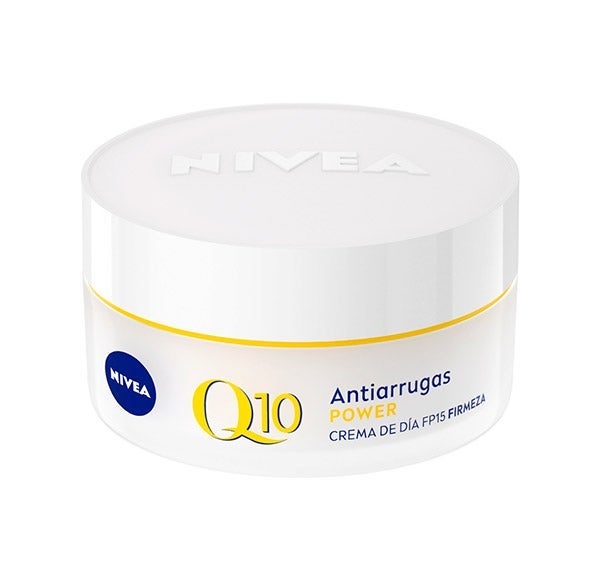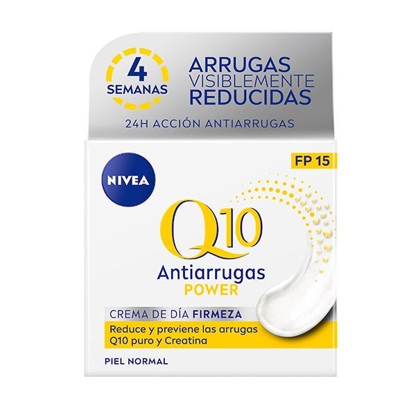 Q10 Antiarrugas POWER Crema de Día SPF15: NIVEA Q10 Antiarrugas POWER Crema de Día SPF15 ayuda a suavizar las arrugas en tan solo 7 días. Su fórmula combina un dúo potenciador de colágeno con Q10 Puro, que estimula la producción natural de colágeno y atenúa las líneas desde el interior; Creatina, que refuerza la síntesis de colágeno y elastina; y Ácido Hialurónico, que aporta volumen y alisa visiblemente la textura de la piel.