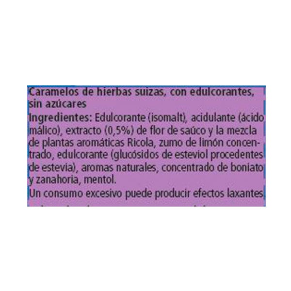 Edulcorante (isomalt), acidulante (ácido málico), extracto (0,5%) de flor de saúco y la mezcla de plantas aromáticas Ricola, zumo de limón concentrado, edulcorante (glucósidos de esteviol procedentes de estevia), aromas naturales, concentrado de boniato y zanahoria, mentol.