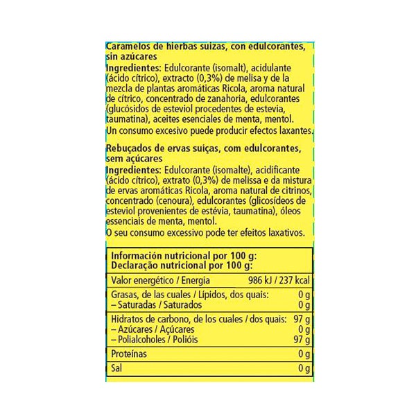 Edulcorante (isomalt), acidulante (ácido cítrico), extracto (0,3%) de melisa y de la mezcla de plantas aromáticas Ricola, aroma natural de cítrico, concentrado de zanahoria, edulcorantes (glucósidos de esteviol procedentes de la estevia, taumatina), aceites esenciales de menta, mentol.
