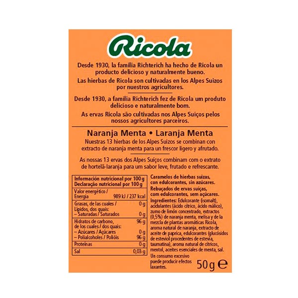 Edulcorante (isomalt), acidulantes (ácido cítrico, ácido málico), zumo de limón concentrado, extractos (0,5%) de naranja menta, melisa y de la mezcla de plantas aromáticas Ricola, aroma natural de naranja, extracto de aceite de paprica, edulcorantes (glucósidos de esteviol procedentes de la estevia, taumatina), aroma natural de cítricos, mentol, aceites esenciales de menta, sal.