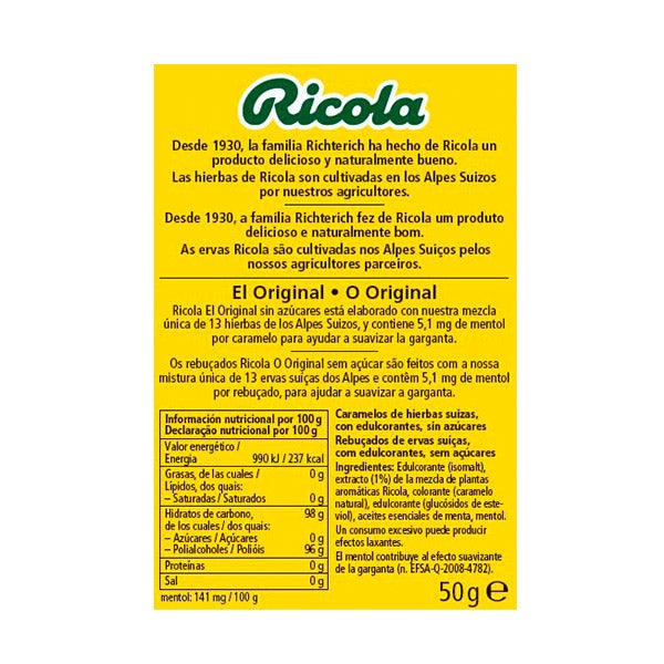 Edulcorante (isomalt), extracto (1%) de la mezcla de plantas aromáticas Ricola, colorante (caramelo natural), edulcorante (glucósidos de esteviol), aceites esenciales de menta, mentol.
