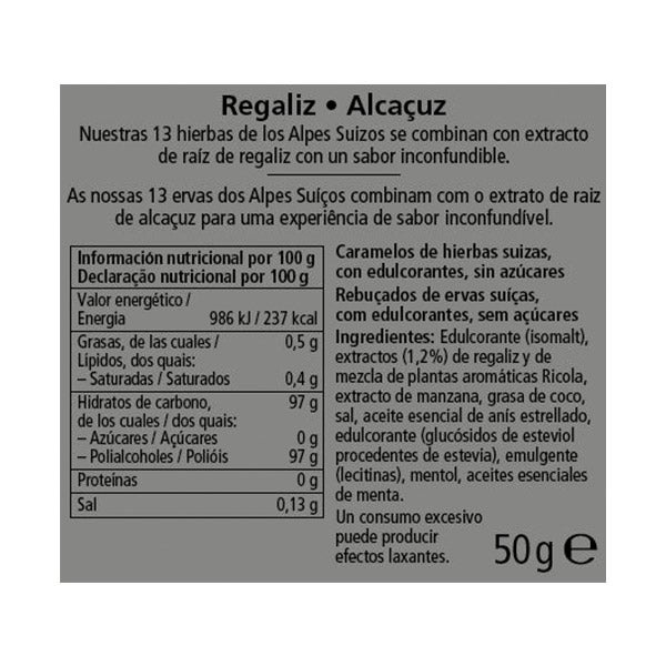Edulcorante (isomalt), extractos (1,2%) de regaliz y de mezcla de plantas aromáticas Ricola, extracto de manzana, grasa de coco, sal, aceite esencial de anís estrellado, edulcorante (glucósidos de esteviol procedentes de la estevia), emulgente (lecitinas), mentol, aceites esenciales de menta.