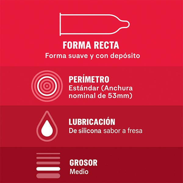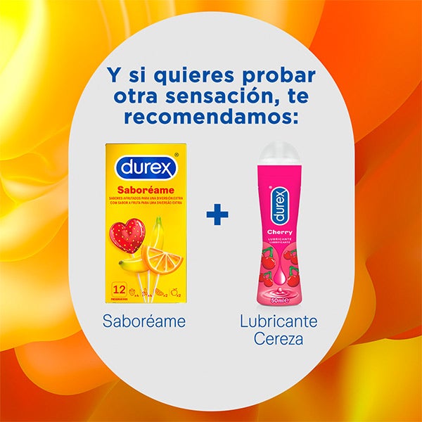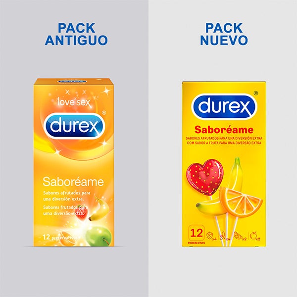 Los preservativos Durex Saboréame incluyen sabores de Fresa, Plátano, Naranja y Manzana, aportando un toque distinto y divertido. Cada condón está lubricado, tiene forma recta y cuenta con depósito para mayor comodidad.