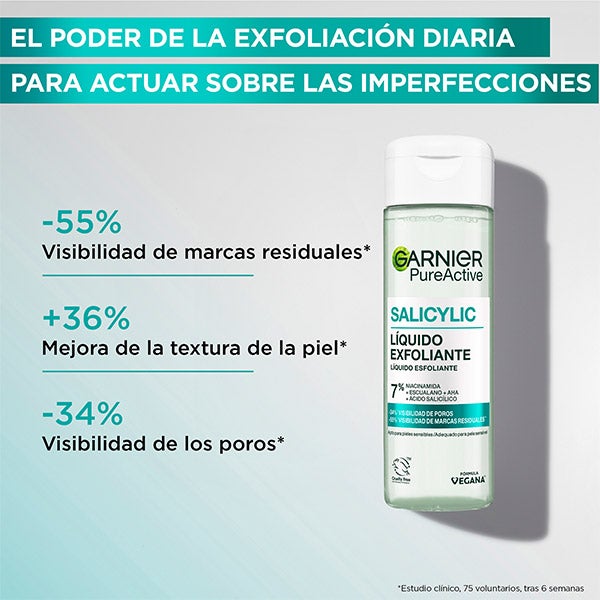 Exfoliante facial líquido con ácido salicílico, adecuado para pieles sensibles, presentado en frasco.