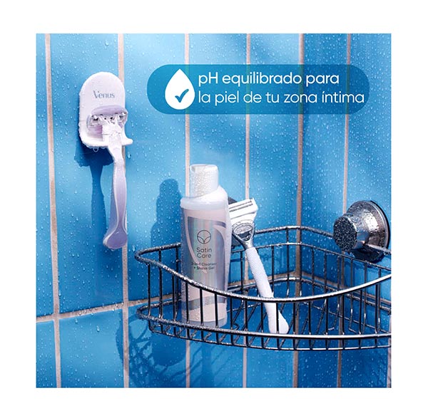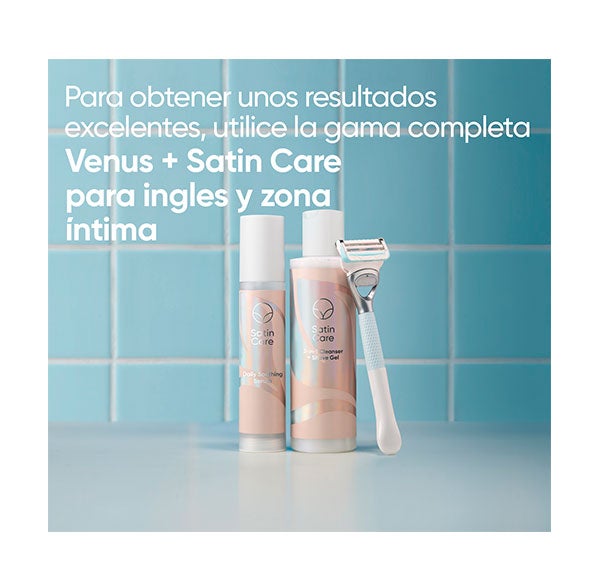 El gel 2-en-1 de Venus Satin Care, que combina gel limpiador y gel de depilación, está diseñado para generar una película protectora que facilita el deslizamiento y reduce la irritación después de la depilación, además de poder emplearse como limpiador suave diario.