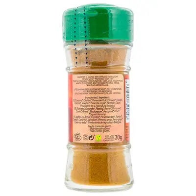 Curry 100% ecológico. Mezcla hindú por excelencia. Compuesto por una combinación de especias que se utilizan en la India para elaborar platos estofados con salsa. El curry combina bien con arroces, verduras y carnes. Tiene un aroma especiado y un sabor ligeramente amargo y un suave punto picante.