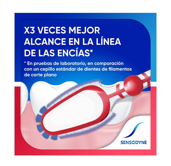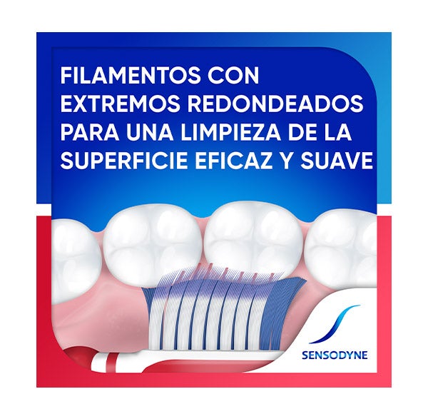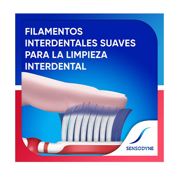 El cepillo de dientes Sensodyne Sensibilidad & Encías combina tres tipos de filamentos para lograr una limpieza profunda tanto en la superficie dental como en los espacios interdentales y a lo largo de la línea de las encías. Este cepillo de dientes Sensibilidad y Encías ofrece un cuidado delicado con el esmalte y las encías.