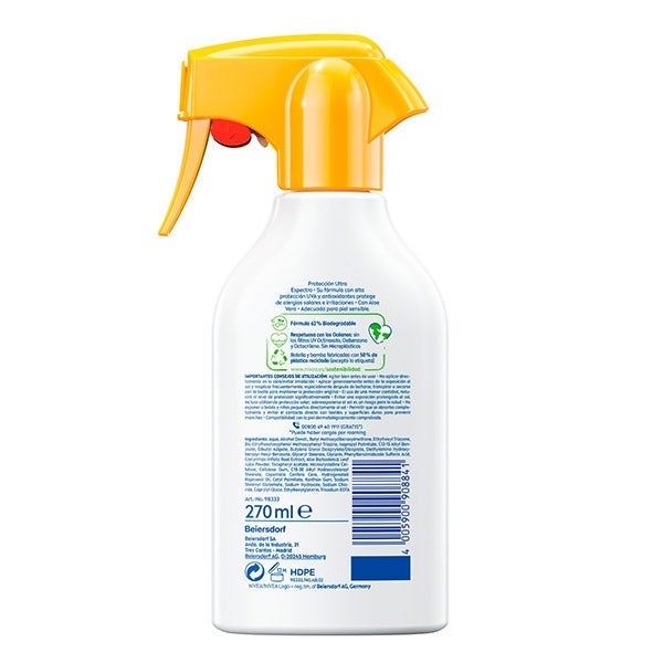 NIVEA SUN Sensitive Antialergias Solares Spray Solar FP50+ ofrece una defensa muy alta y de acción inmediata contra los rayos UVA/UVB gracias a su fórmula con antioxidantes, que ayuda a prevenir irritaciones y alergias solares. Diseñada especialmente para pieles sensibles, su composición sin perfume con Aloe Vera Bio proporciona confort y es resistente al agua.