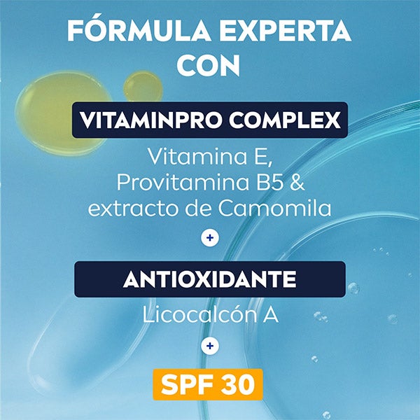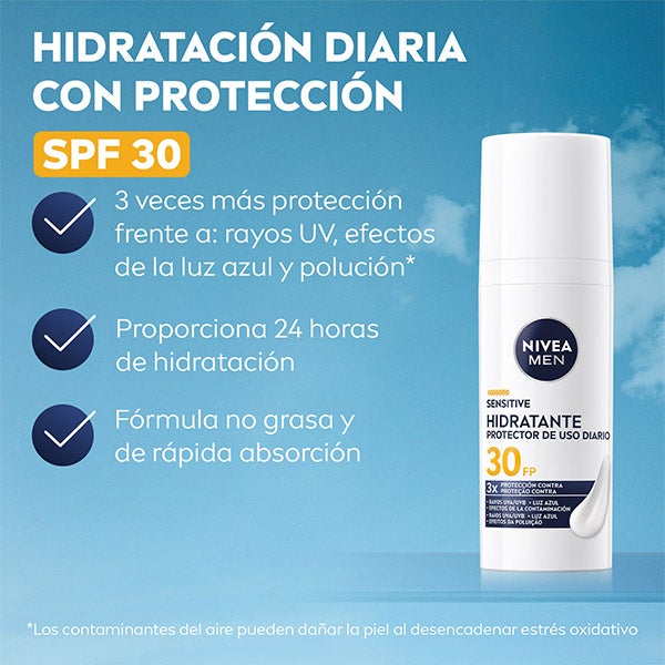 NIVEA MEN Sensitive Hidratante Protector cuida eficazmente la piel sensible gracias a su SPF30, su Complejo VitaminPRO y su aporte de antioxidantes. De textura ligera, sin sensación grasa y libre de alcohol*, ofrece una protección triple frente a la radiación UVA/UVB, la luz azul y los efectos de la contaminación, manteniendo la piel hidratada y con aspecto saludable durante todo el día.