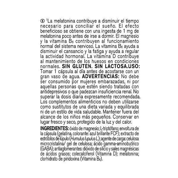 oxido de magnesio;L-triptófano, envoltura de la capsula (gelatima.colorante;azul brillante FCF);extracto de estróbilos de Lúpulo (Humulus Lupulus L.), agente de carga;celulosa microcristalina/gel de celulosa;acido gamma-aminobutrico(GABA);ANTIAGLOMERANTES:DIOXIDO DE SILICO y sales magnésicas de acidos grasos;colecalciferol(Vitamina D);melatonina;clorhidrato de piridoxina(vitamina b6)