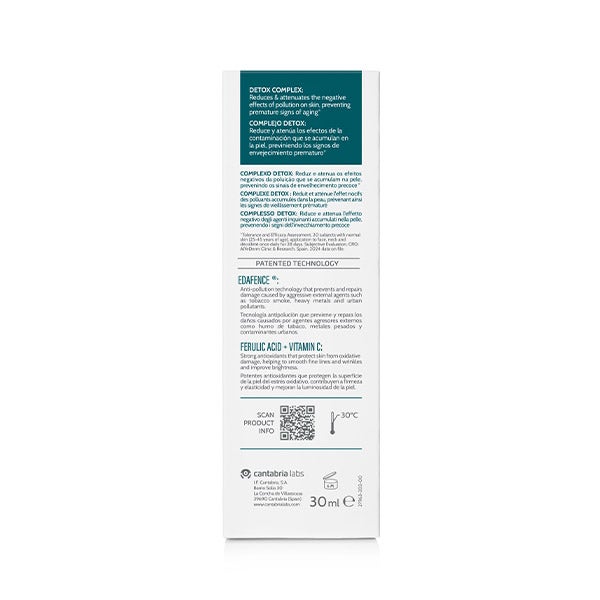Su formulación incorpora EDAFENCE®, una avanzada tecnología antipolución con eficacia comprobada frente a metales pesados, humo de tabaco y contaminantes del aire, incluido el ozono presente tanto en áreas urbanas como rurales, así como frente a la luz azul emitida por dispositivos digitales. Además, combina el sistema antioxidante de alto rendimiento Advanced Antiox Synergy y la tecnología SCA® Growth Factor Technology, ambos con propiedades antioxidantes y reparadoras, junto con vitamina C, ácido ferúlico y vitamina E para una protección integral.