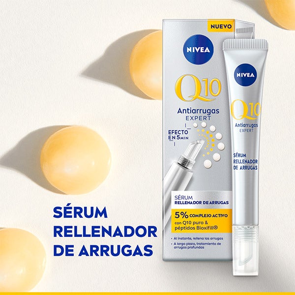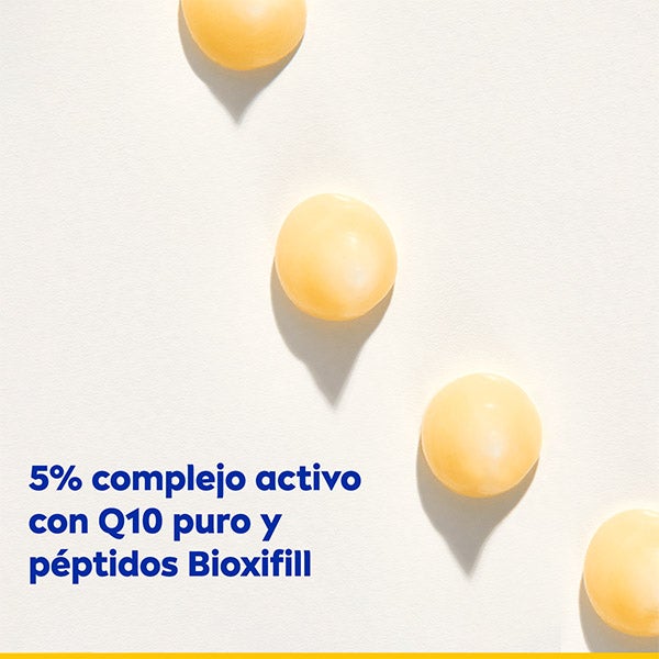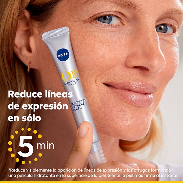 NIVEA Q10 Antiarrugas EXPER. Efecto antiedad demostrado: en solo 5 minutos ayuda a disminuir de manera visible la apariencia de arrugas y líneas finas, creando una película hidratante sobre la piel. La sensación es inmediata: el rostro luce más firme y con un tacto terso. Después de 2 semanas, las diferentes arrugas se muestran visiblemente rellenadas. Con un uso prolongado, actúa como tratamiento para arrugas profundas. Su fórmula con un 5% de complejo activo combina coenzima Q10 pura, péptidos Bioxifill® y componentes antiedad que penetran en las capas de la epidermis* para estimular la síntesis de colágeno y combatir los signos de envejecimiento desde el interior**. Compatibilidad cutánea comprobada dermatológicamente. en capas superiores de la epidermis. test in vitro.