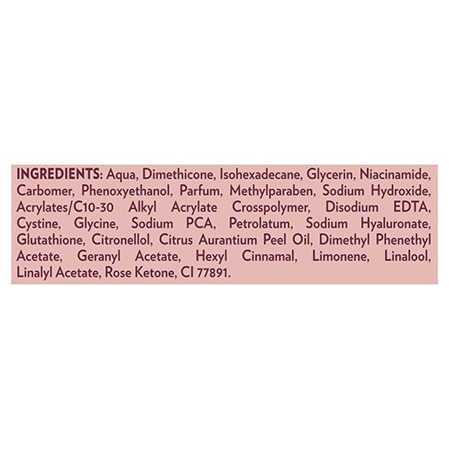 Aqua, Dimethicone, Isohexadecane, Glycerin, Niacinamide, Carbomer, Phenoxyethanol, Parfum, Methylparaben, Sodium Hydroxide, Acrylates/C10-30Alkyl Acrylate Crosspolymer, DisodiumEDTA, Cystine, Glycine, SodiumPCA, Petrolatum, Sodium Hyaluronate, Glutathione, Citronellol, Citrus Aurantium Peel Oil, Dimethyl Phenethyl Acetate, Geranyl Acetate, Hexyl Cinnamal, Limonene, Linalool, Linalyl Acetate, Rose Ketone, Cl 77891.