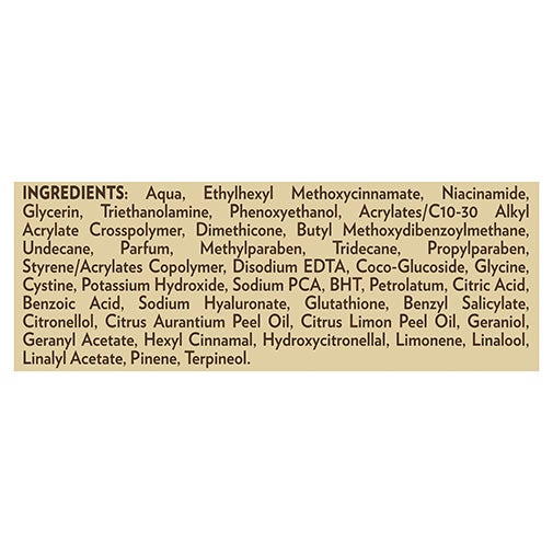 Aqua, Ethylhexyl Methoxycinnamate, Niacinamide, Glycerin, Triethanolamine, Phenoxyethanol, Acrylates/C10-30Alkyl Acrylate Crosspolymer, Dimethicone, Butyl Methoxydibenzoylmethane, Undecane, Parfum, Methylparaben, Tridecane, Propylparaben, Styrene/Acrylates Copolymer, DisodiumEDTA, Coco-Glucoside, Glycine, Cystine, Potassium Hydroxide, SodiumPCA, BHT, Petrolatum, Citric Acid, Benzoic Acid, Sodium Hyaluronate, Glutathione, Benzyl Salicylate, Citronellol, Citrus Aurantium Peel Oil, Citrus Limon Peel Oil, Geraniol, Geranyl Acetate, Hexyl Cinnamal, Hydroxycitronellal, Limonene, Linalool, Linalyl Acetate, Pinene, Terpineol.