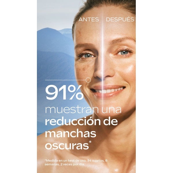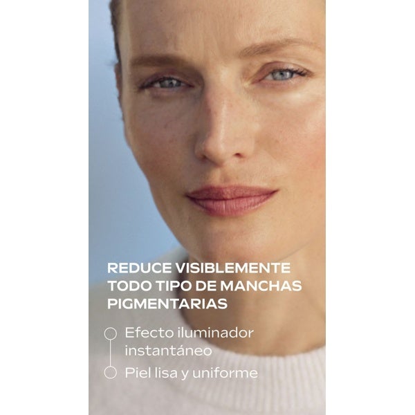 Su avanzada composición actúa sobre todo tipo de hiperpigmentaciones —ya sean provocadas por el sol, la edad o las marcas de acné— mientras mejora la tonicidad y la elasticidad cutánea. El resultado es una piel de aspecto más uniforme, radiante y visiblemente rejuvenecida.