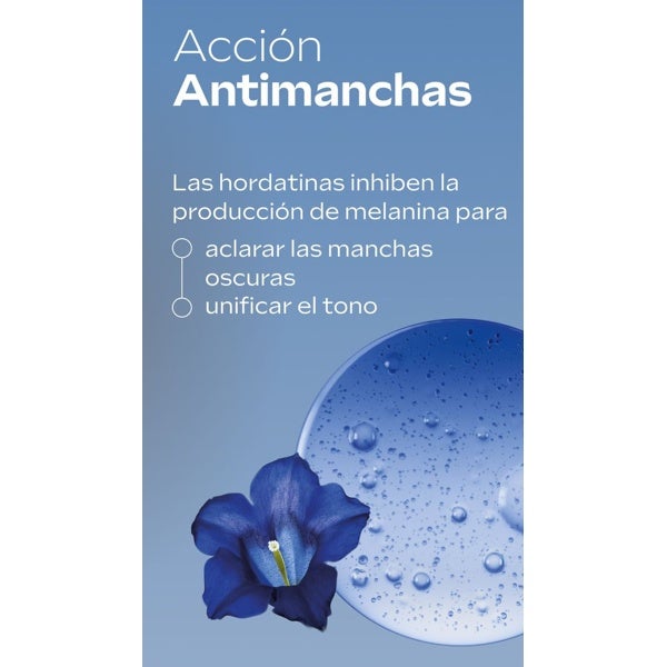 Gracias a las hordatinas, el sérum actúa directamente sobre la producción de melanina, favoreciendo la atenuación y aclarado de las manchas existentes y ayudando a prevenir su regreso.