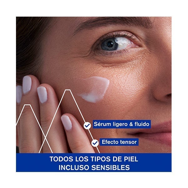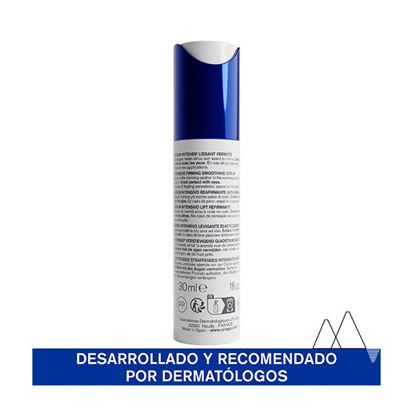 Este suero reafirmante alisador intensivo actúa a la vez sobre las arrugas, la tonicidad y las agresiones externas diarias como la luz azul, los rayos UV, la contaminación, el estrés y el cansancio.