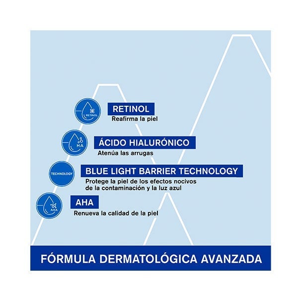 Con una fórmula potenciada por activos antiedad [retinol** + ácido hialurónico], ayuda a reducir la apariencia de las líneas de expresión y arrugas, combatiendo la pérdida de firmeza y tono.
