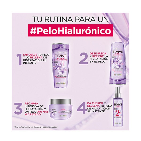Descubre el nuevo Sérum Rellenador, con un 2% de Complejo Hialurónico, que redensifica y aporta una intensa dosis de hidratación al momento. El Sérum Hidra Hialurónico infunde la fibra capilar con hidratación de manera instantánea.