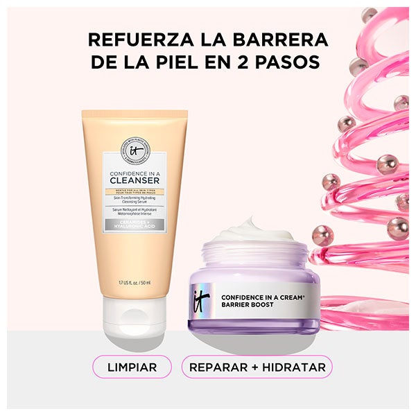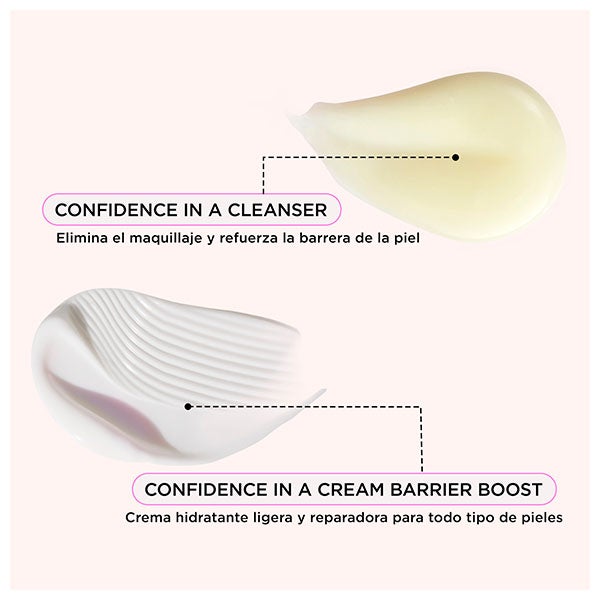 Inicia el cuidado con Confidence in a Cleanser (50 ml), un limpiador de uso diario con textura en sérum que elimina maquillaje e impurezas sin causar sequedad. Su composición con ceramidas y ácido salicílico purifica a fondo mientras conserva el equilibrio natural de la piel. Luego sigue con Confidence in a Cream Barrier Boost (60 ml), una crema ligera con efecto calmante que brinda hidratación prolongada hasta por 100 horas. Contiene niacinamida, escualano, extracto de centella asiática y avena coloidal para fortalecer la barrera cutánea y reducir sequedad, irritaciones y rojeces.
