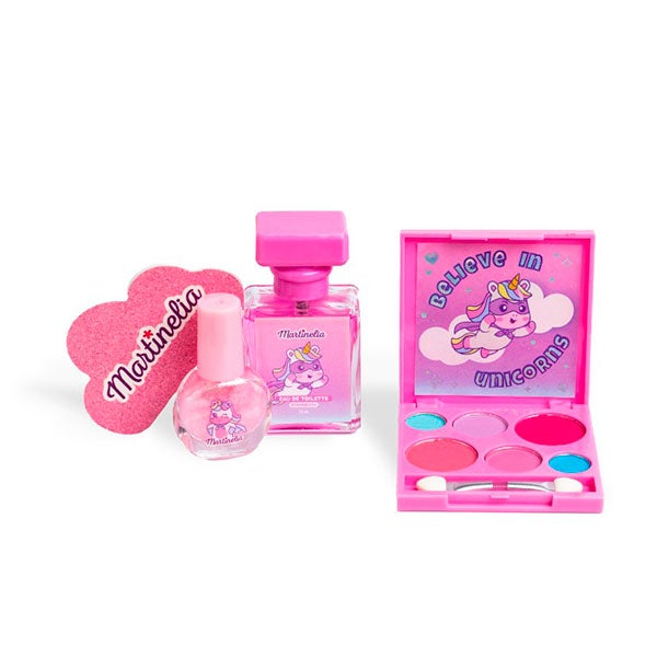 Este set de inspiración mágica reúne una fragancia envolvente, una paleta de sombras de ojos con matices de unicornio, una lima y un esmalte de uñas brillante que aportan el toque final a tu estilo.