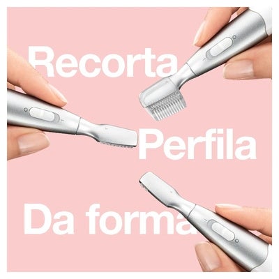 Mini recortadora de precisión Braun para cejas, diseñada para un recorte y perfilado preciso en cualquier momento y lugar. Su tamaño compacto facilita la portabilidad y el uso, ideal para retoques y detalles de última hora. También es apta para eliminar vello facial no deseado con precisión. Funciona con batería recargable.