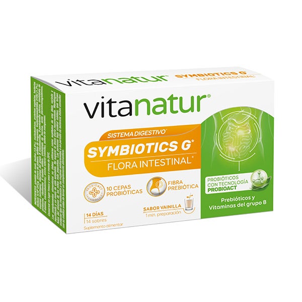Vitanatur Symbiotics G combina prebióticos, probióticos y vitaminas del complejo B que contribuyen a conservar el equilibrio natural de la flora intestinal.