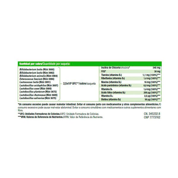 Almidón de maíz, inulina (13,8%), maltodextrinas, proteínas vegetales, bacterias lácticas 1x109 UFC/g, cloruro de potasio, sulfato de magnesio, fructooligosacáridos (FOS) (1,2%), enzimas (amilasas), vitaminas del grupo B [nicotinamida (niacina), D-pantotenato cálcico (ácido pantoténico), clorhidrato de piridoxina (vitamina B6), riboflavina 5’-fosfato sódico (riboflavina), clorhidrato de tiamina (tiamina), ácido pteroilmonoglutámico (ácido fólico), D-biotina (biotina), cianocobalamina (vitamina B12)] sulfato de manganeso (manganeso).