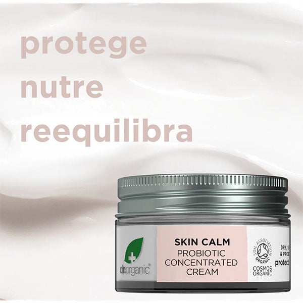 La Crema Probiótica Skin Calm de Dr. Organic es un tratamiento intensivo que refuerza, nutre y ayuda a restaurar la barrera natural de la piel, contribuyendo a mantener en equilibrio su microbioma.