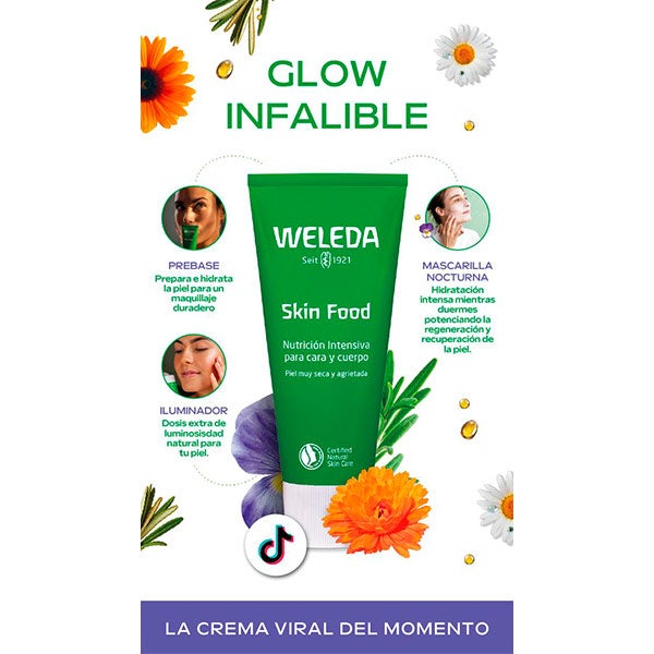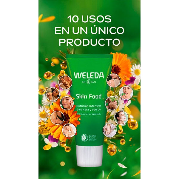 Skin Food Original de Weleda es una crema intensamente nutritiva creada en 1926, que combina extractos naturales de pensamiento silvestre, caléndula, romero y camomila. Hidrata, regenera y suaviza en profundidad las pieles secas o agrietadas.