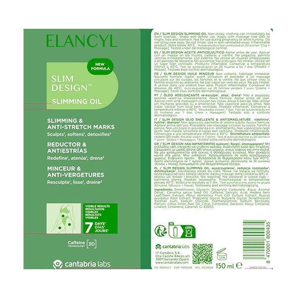 Aceite Anticelulítico Slim Design Elancyl elaborado con Cafeína y aceite de Camelina.