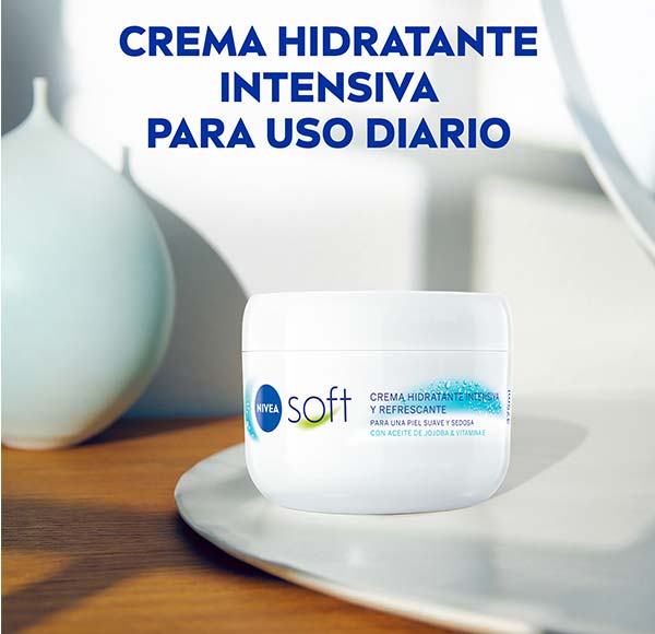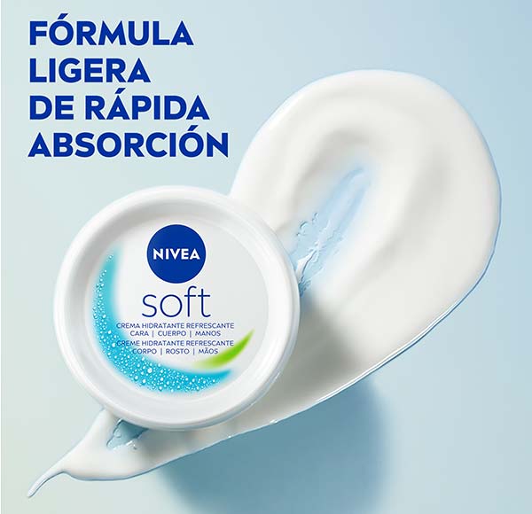NIVEA Soft es una crema hidratante intensiva versátil que brinda una sensación de frescura única. Su textura ligera, enriquecida con vitamina E y Aceite de Jojoba, se absorbe en segundos, aportando una hidratación profunda que deja la piel suave, lisa y con un tacto sedoso. Este cuidado diario de NIVEA es perfecto para mantener nutrida y protegida la piel del rostro, las manos y el cuerpo. Compatibilidad dermatológicamente aprobada.