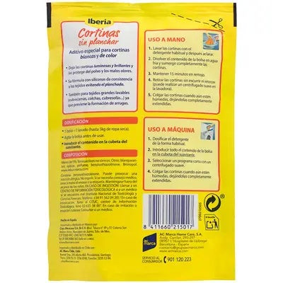 Con Iberia - Cortinas sin planchar, lavar tus cortinas y visillos ya no es una tarea complicada. Este tratamiento avanzado está diseñado para limpiar, devolver el blanco original y revitalizar los tejidos, dejándolos como nuevos sin necesidad de planchado. Gracias a su fórmula con siliconas y apresto, tus textiles ganan cuerpo, suavidad y un brillo renovado.