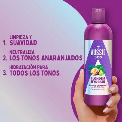 Características principales de Aussie SOS Blonde ChampúEl SOS Blonde Champú es la solución de emergencia para cualquier melena rubia, con mechas o gris que muestre tonos indeseados. Su principal función, gracias a sus pigmentos morados, es neutralizar al instante los molestos reflejos cobrizos y amarillos, dejando el color limpio y mucho más luminoso.