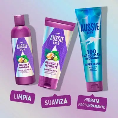 ¿Tu rubio, mechas o canas han perdido la magia? El SOS Blonde Champú de Aussie es justo lo que tu cabello necesita. Su fórmula morada, enriquecida con superalimentos australianos, neutraliza al instante los tonos amarillos y cobrizos no deseados. Además, proporciona una hidratación intensa, dejando tu melena suave, luminosa y con un brillo espectacular. Tu rubio merece seguir siendo mágico... ¡Y este champú lo hace posible!