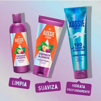 Características principales de Aussie SOS Lengths ChampúEl SOS Lengths Champú es el producto de rescate heroico de la marca, especialmente formulado para cabello largo y dañado que está a punto de romperse por el estrés o el ajetreo diario.