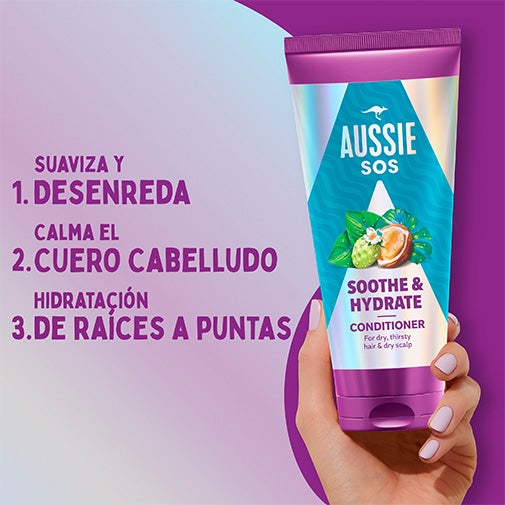 El acondicionador Aussie SOS Soothe & Hydrate es el aliado perfecto para devolver el confort a tu cabello. Formulado con superalimentos australianos, este acondicionador desenreda, hidrata y reconforta el cuero cabelludo mientras nutre la fibra capilar, dejando el pelo sedoso, manejable y lleno de brillo de la raíz a las puntas. ¡Voilà! Para resultados óptimos, combínalo con los otros productos de la gama capilar Aussie SOS Soothe & Hydrate.