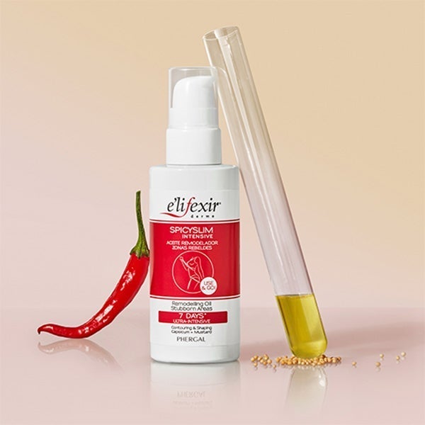 Elfexir Dermo Spicyslim es un aceite seco diseñado para ayudar a reducir la grasa en las zonas más resistentes.