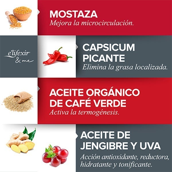 Su fórmula, enriquecida con extractos de Mostaza y Capsicum picante, estimula la circulación para optimizar la eficacia y favorecer la termogénesis, contribuyendo a eliminar la grasa localizada. Además, incorpora aceite de Café Verde, que impulsa y mantiene la energía celular para garantizar resultados visibles en una semana.