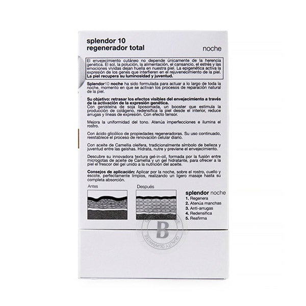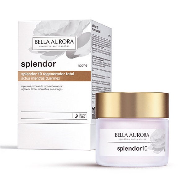 Splendor 10 Regenerador Total noche de Bella Aurora es una crema de cuidado nocturno antiedad que actúa mientras duermes, ayudando a frenar el envejecimiento cutáneo y a restaurar la luminosidad y aspecto joven de la piel.