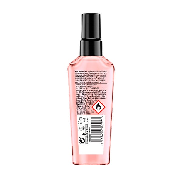 Sérum con tecnología split hair miracle, elaborada con un complejo iónico y aceite de semilla de uva, que ayuda a reparar las puntas abiertas y mantiene sus resultados incluso después del lavado.