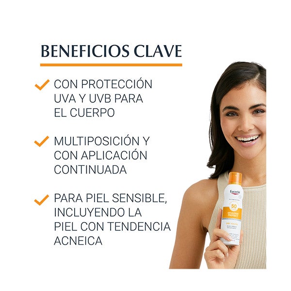 Eucerin Sun Spray Transparent Dry Touch Sensitive Protect FPS 50 es un protector solar corporal en formato spray, desarrollado para pieles sensibles, incluso aquellas con tendencia acneica.