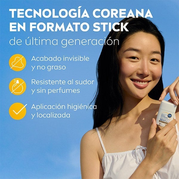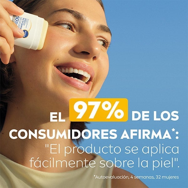 NIVEA SUN Protección Facial Transpirable Stick UV Tacto Sedoso SPF 50+ ofrece una defensa facial que va más allá del simple factor solar. Su práctica tecnología UV transpirable ayuda a prevenir el fotoenvejecimiento sin bloquear los poros y asegura una protección muy elevada frente a los rayos UVA y UVB. Gracias a su avanzada tecnología coreana en formato stick, cuida las zonas más sensibles del rostro permitiendo que la piel respire libremente. Su textura de Tacto Sedoso se absorbe sin dejar sensación grasa ni residuos visibles, además de ser resistente al agua, sin perfume y no comedogénica. El diseño en forma de gota facilita su aplicación sin ensuciar las manos, perfecto para el uso cotidiano y para reaplicar cuantas veces sea necesario. Este protector solar ligero, con aval dermatológico y oftalmológico, garantiza una protección invisible y resistente al sudor, ideal para cuidar la piel más delicada en cualquier momento del día.