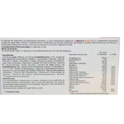 DeMemory Studio es un complemento alimenticio a base de Jalea Real, Fosfatidilcolina, Fosfatidilserina, Taurina, Glutation, Vitaminas y Minerales. Contribuye al rendimiento intelectual normal y a la función cognitiva normal.