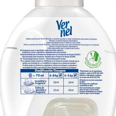 Vernel Concentrado Delicado es un suavizante que respeta incluso las pieles más sensibles gracias a una fragancia suave apta para bebés y personas con alergias en la piel.