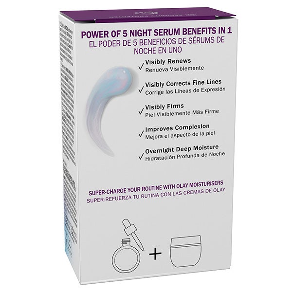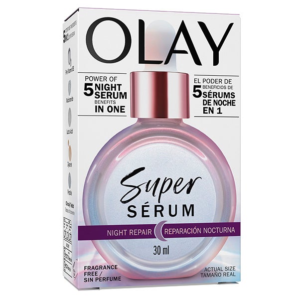 Transforma tu rutina de cuidado facial con Olay Super Sérum Reparación Nocturna, un sérum intensivo que concentra cinco beneficios clave en cada aplicación.