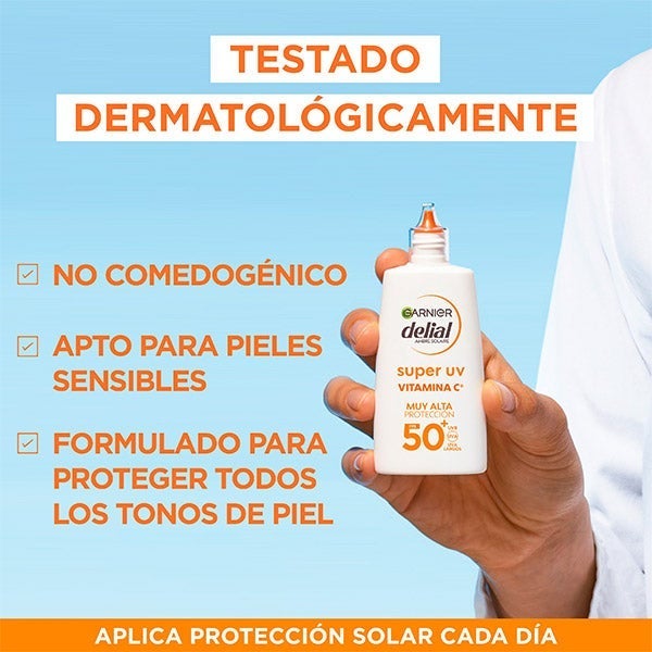 Garnier Delial SUPER UV Vitamina C FPS50+ Crema Facial Fluida Anti-Manchas oscuras brinda una defensa diaria muy elevada frente a los rayos UVB y UVA, mientras deja la piel con un aspecto radiante y uniforme.