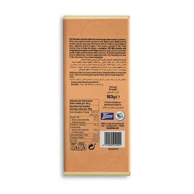 ¡Experimenta la mezcla perfecta de sabores con nuestro Chocolate con leche relleno de crema de yogur Tirma en su irresistible presentación de tableta 103g sabor naranja!